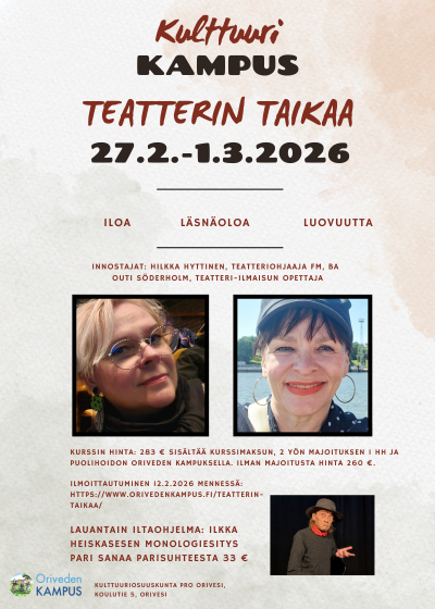 Kulttuurikampus on monipuolinen kulttuuri- ja tapahtumakeskus entisen Oriveden Opiston tiloissa hyvien kulkuyhteyksien ulottuvissa. Meille mahtuu isompikin porukka kokoustamaan, juhlimaan, vetäytymään, työskentelemään ja majoittumaan. Tervetuloa!