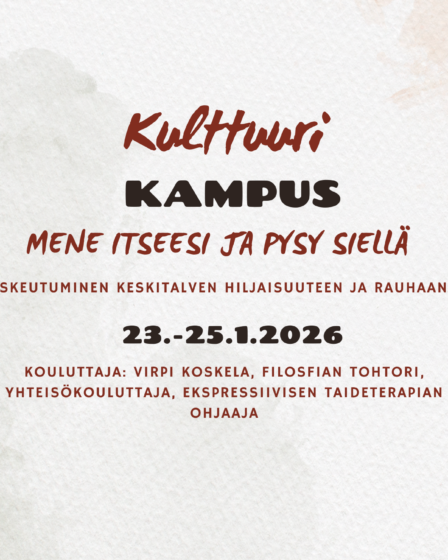 Mene itseesi ja pysy siellä – laskeutuminen keskitalven hiljaisuuteen ja rauhaan 23.1.2026 – 25.1.2026 Tule rauhoittumaan kehollisen tiedon, läsnäolon ja luontoyhteyden syliin kasvisruoan ja talvimaisemien äärellä! Viikonlopun aikana tutustutaan luonto- ja läsnäoloharjoitusten kautta erilaisiin tapoihin rentoutua, hiljentyä ja yhdistyä niin itseen, toisiin kuin ympäröivään luontoon. Lopuksi sunnuntaina tehdään yhteinen rauhanrituaali. Kurssin aloitus perjantaina 23.1.2026 klo 18.00 …