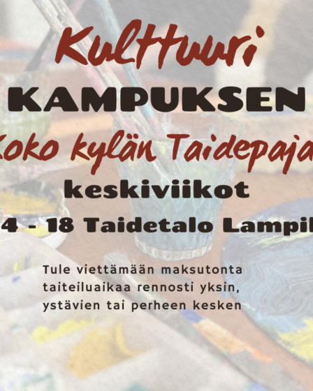 Oriveden Kampuksen Koko kylän Taidepaja Oriveden Kampus käynnistää kaikille avoimen Taidepajatoiminnan taidetalo Lampilassa. Kampuksen taidetalkkariden Heidi Meriläisen ja Mika Pettissalon johdolla kuka tahansa voi taiteilla maksutta joulunavauksessa vaikkapa Joulupukin tapaamista odotellessa. Koko kylän Taidepaja on avoinna aina arkikeskiviikkoisin klo 14 -18. alkaen 27.11.2025. Pajassa on vapaat kädet luoda omaa taidetta, mitä vaan voi ja saa …