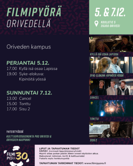 Tervetuloa nauttimaan elokuvan taiasta Oriveden kampukselle 5. & 7.12! Leffaviikonloppu järjestetään poikkeuksellisesti perjantaina ja sunnuntaina, sillä lauantai on itsenäisyyspäivä. Monipuolinen ohjelmisto tarjoaa elämyksiä koko perheelle tontuista aina Syke-elokuvan kipinöihin ja kotimaiseen toimintaan. o o o OHJELMISTO: PE 5.12.17.00 Kyllä isä osaa Lapissa -S-19.00 Syke-elokuva: Kipinöitä yössä -K12- SU 7.12.13.00 Cancel -K7-15.00 Tonttu -K7-17.00 Sisu 2 …