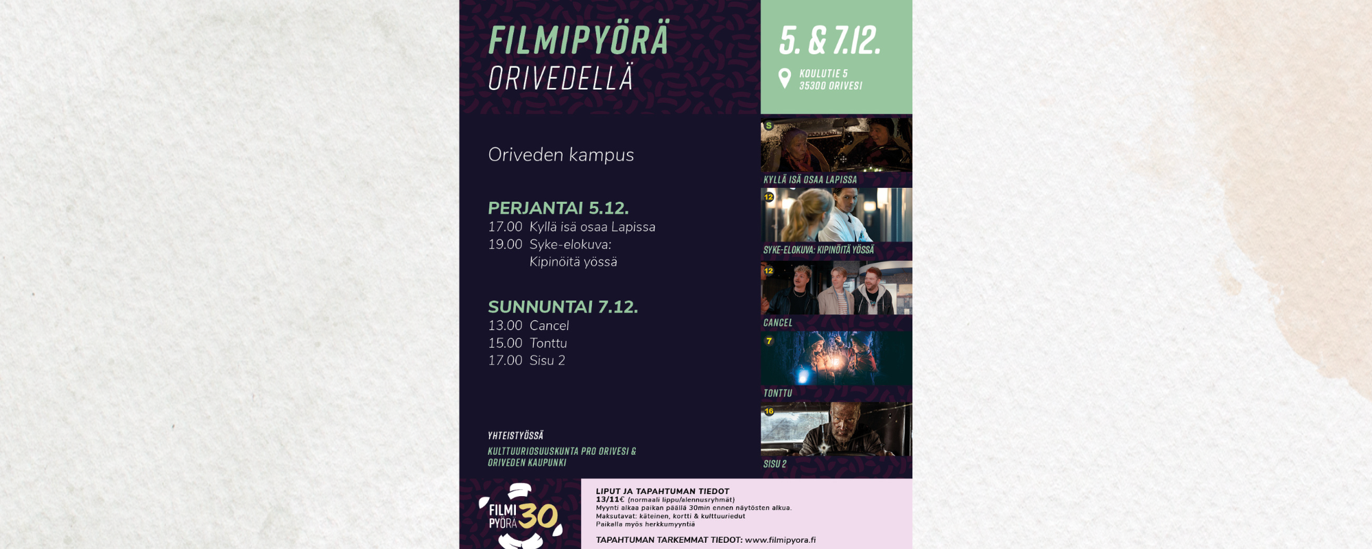 Tervetuloa nauttimaan elokuvan taiasta Oriveden kampukselle 5. & 7.12! Leffaviikonloppu järjestetään poikkeuksellisesti perjantaina ja sunnuntaina, sillä lauantai on itsenäisyyspäivä. Monipuolinen ohjelmisto tarjoaa elämyksiä koko perheelle tontuista aina Syke-elokuvan kipinöihin ja kotimaiseen toimintaan.
