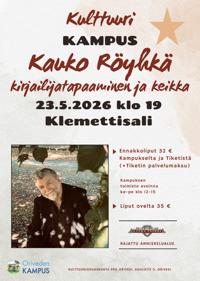 Liput ennakkoon Kampuksen toimistolta ja Tiketistä 32 € (+ Tiketin palvelumaksu). Kampuksen toimisto avoinna ke-pe klo 12-15