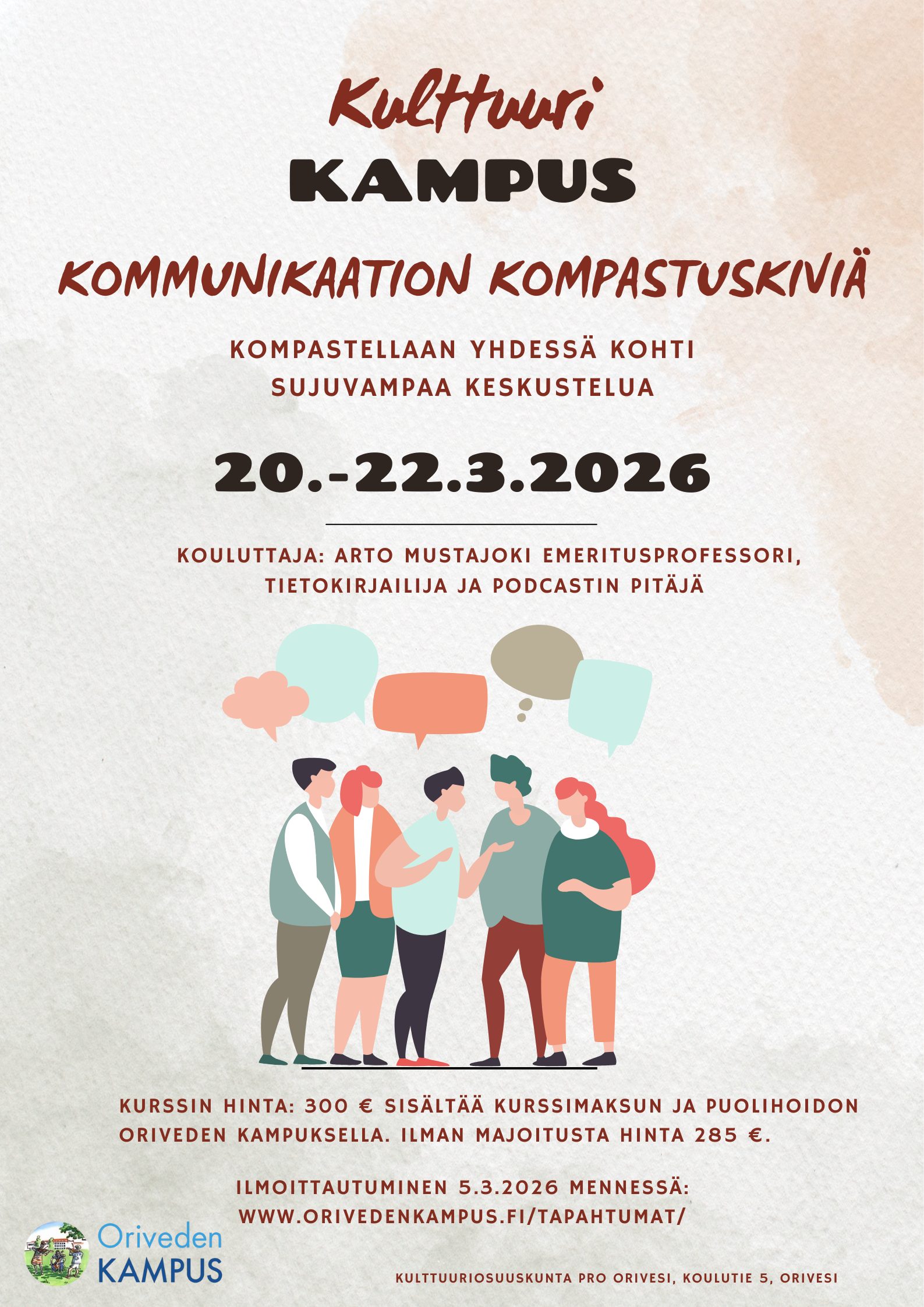 Kurssin aloitus perjantaina 20.3.2026 klo 17.00 ja päätös sunnuntaina 22.3.2026 klo 14.00. Kurssin tarkka aikataulu julkaistaan lähempänä ajankohtaa.