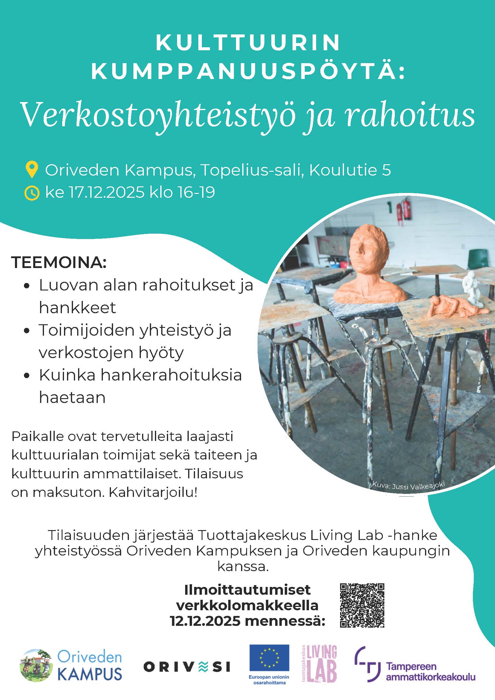 Paikalle ovat tervetulleita laajasti kulttuurialan toimijat sekä taiteen ja kulttuurin ammattilaiset. Tilaisuus järjestetään Oriveden Kampuksen Topelius-salissa, (Koulutie 5, 35300 Orivesi).