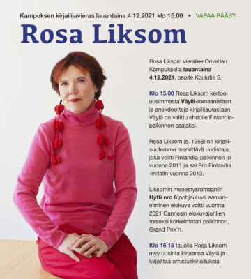 Suuri kirjailija- ja elokuvailta 4.12.2021 Rosa Liksom – Väylä – Hytti nro 6 – James Bond – 007 No Time To Die