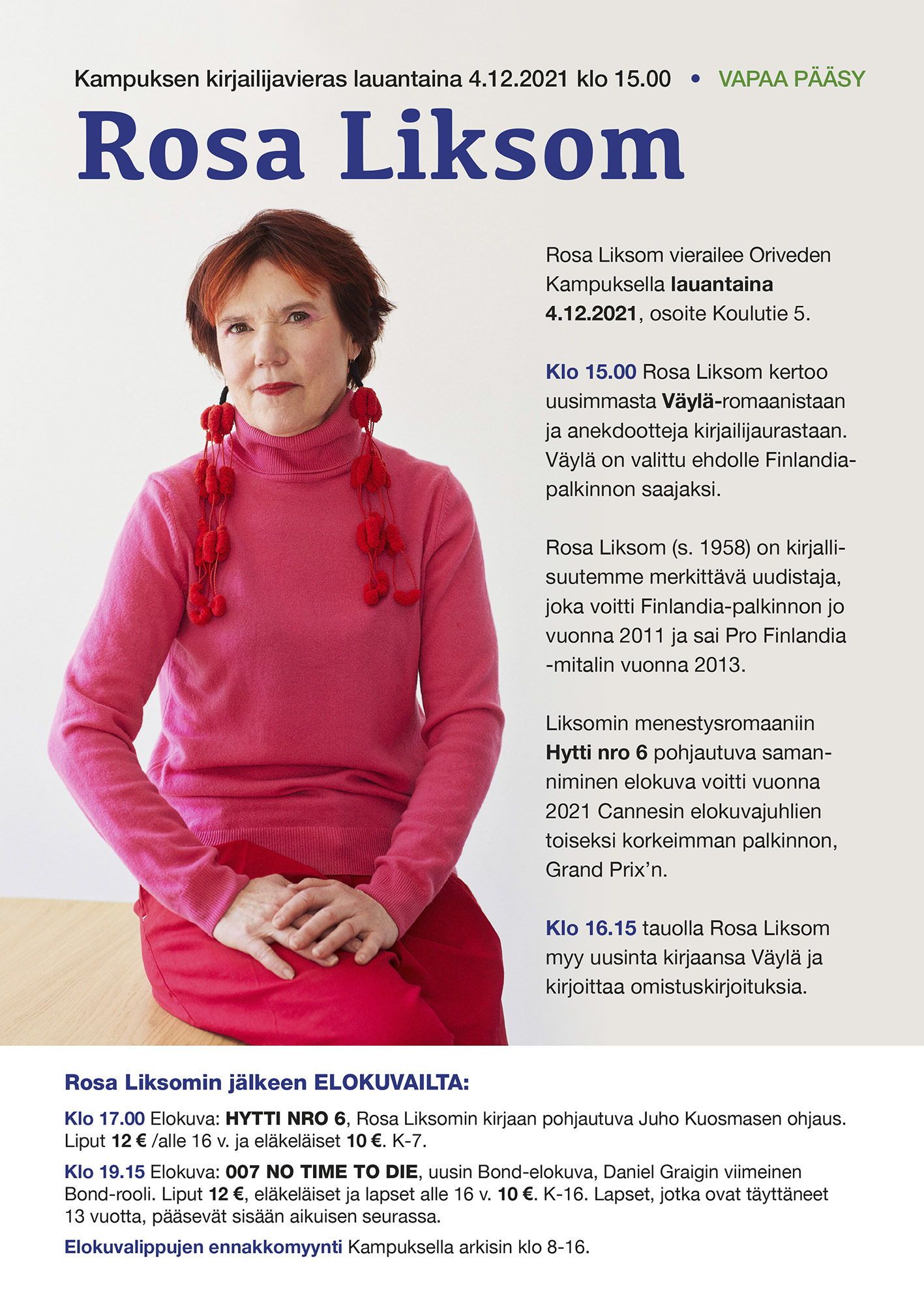Suuri kirjailija- ja elokuvailta 4.12.2021 Rosa Liksom – Väylä – Hytti nro 6 – James Bond – 007 No Time To Die
